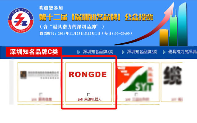 2014年,深圳市榮德機(jī)器人科技有限公司作為國家級高新技術(shù)企業(yè),廣東省名牌產(chǎn)品,成功入選第十二屆“深圳知名品牌”評選活動,并定于2014年11月25日至12月1日(每天8:00-20:00)進(jìn)行公眾投票,投票結(jié)果直接決定公司是否被評選上。所以特請各位朋友幫忙榮德公司投上一票。謝謝!投票具體規(guī)則如下: