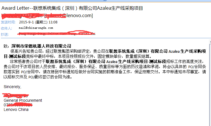 很高興告知貴公司,經(jīng)過聯(lián)想集團采購組評定,貴公司在聯(lián)想系統(tǒng)集成(深圳)有限公司Azalea生產(chǎn)線采購項目-測試標段競標中最終中標,本項目按照報價文件,固定模塊單價,數(shù)量據(jù)實結算。