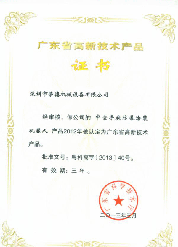 恭祝我司噴涂機(jī)器人榮獲廣東省高新技術(shù)產(chǎn)品證書