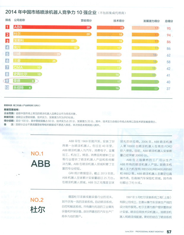 日前,國(guó)內(nèi)某權(quán)威機(jī)器人產(chǎn)業(yè)雜志對(duì)2014年中國(guó)市場(chǎng)噴涂機(jī)器人的核心市場(chǎng)競(jìng)爭(zhēng)力進(jìn)行了深入了解并根據(jù)各企業(yè)營(yíng)收、技術(shù)、發(fā)展?jié)摿θ?xiàng)重要指標(biāo)進(jìn)行評(píng)分,并得出最終排名,榮德公司在所有入圍的十家企業(yè)里面排名第九,排名前八名的均為國(guó)外巨頭,榮德公司在中國(guó)國(guó)內(nèi)的排名中處于第一名的領(lǐng)先地位,這也符合榮德公司“中國(guó)噴涂機(jī)器人領(lǐng)先品牌”的戰(zhàn)略地位。