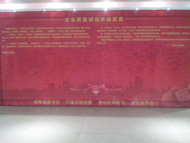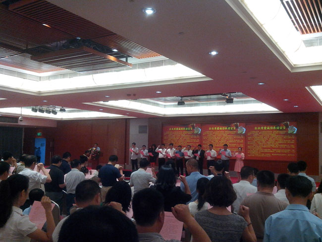 大會(huì)的高潮部分是所有與會(huì)的企業(yè)代表與政界代表一起舉起右手,宣讀《企業(yè)質(zhì)量誠信承諾書》:為構(gòu)建誠信經(jīng)營、公平競爭的市場環(huán)境,加強(qiáng)質(zhì)量誠信體系建設(shè),切實(shí)保證產(chǎn)品質(zhì)量,維護(hù)消費(fèi)者的合法權(quán)益,推動(dòng)建設(shè)“質(zhì)量強(qiáng)國”,促進(jìn)“質(zhì)量強(qiáng)市”、“質(zhì)量惠民”。本企業(yè)向社會(huì)鄭重承諾:一、牢固樹立“質(zhì)量第一”的思想,不斷增強(qiáng)質(zhì)量意識(shí)和社會(huì)責(zé)任意識(shí),保證和提高產(chǎn)品質(zhì)量,落實(shí)企業(yè)質(zhì)量主體責(zé)任,滿足人們?nèi)罕妼?duì)高質(zhì)量產(chǎn)品的期待和需求,增強(qiáng)人民群眾的消費(fèi)信心。二、嚴(yán)格遵守《產(chǎn)品質(zhì)量法》、《標(biāo)準(zhǔn)化法》、《計(jì)量法》等法律法規(guī),嚴(yán)格執(zhí)行產(chǎn)品標(biāo)準(zhǔn),不制假、不售假,杜絕虛假宣傳,堅(jiān)決抵制假冒偽劣、欺詐消費(fèi)者等失信違法行為,不侵害其他企業(yè)合法權(quán)益。三、加強(qiáng)全員、全過程、全方位的質(zhì)量管理,推行先進(jìn)質(zhì)量管理方法,完善計(jì)量保證體系、標(biāo)準(zhǔn)化體系和質(zhì)量保證體系,嚴(yán)格原材料,生產(chǎn)過程、產(chǎn)品出廠和儲(chǔ)運(yùn)銷售全過程的照顧質(zhì)量控制。四、建立質(zhì)量安全事故主動(dòng)報(bào)告制度,嚴(yán)格落實(shí)質(zhì)量安全責(zé)任追究制度,完善產(chǎn)品質(zhì)量追溯體系,及時(shí)解決消費(fèi)者的質(zhì)量投訴,自覺履行產(chǎn)品質(zhì)量召回、“三包”等產(chǎn)品質(zhì)量責(zé)任和義務(wù)。本單位嚴(yán)格履行以上承諾。如有違反,愿意承擔(dān)相應(yīng)的法律責(zé)任,接受將失信違法行為納入不良信用記錄并向社會(huì)公開。二0一四年九月五日