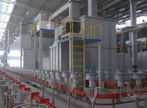 涂裝生產線主要工藝流程是上件→拋丸除銹→清理吹灰→噴鋁→底漆噴漆流平→底漆烘干→中涂噴漆流平→中涂烘干→面漆噴漆流平→面漆噴漆烘干→下件。涂裝線的防腐環(huán)境是室外(不直接淋雨),高架橋腹部波紋板。保護年限為長效型,50年。主要針對工廠構件外表面涂漆,不考慮施工后涂裝。前處理拋丸,Sa3.0級、粗糙度/75-120um、清潔度/1級?;耐繉訛殡娀釃婁X,120-150μm;底涂層為環(huán)氧富鋅底漆,60-80μm,90℃60分鐘烘干。中間涂層為環(huán)氧云鐵中間漆,150-180μm;90℃90分鐘烘干。 面漆為丙烯酸聚氨酯或氟碳漆面漆,40-60μm。90℃60分鐘烘干??偲崮ず穸龋骸?50μm。
